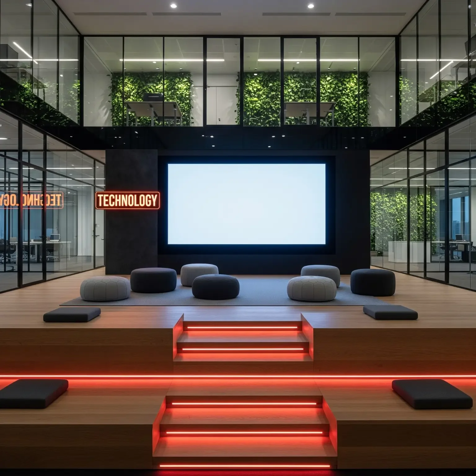 En estas áreas, utilizamos el espectro RGB completo para crear ambientes de alta energía y alto contraste. Estos colores vivos y dinámicos sirven como un punto de desconexión total, juego y team building durante las pausas activas.